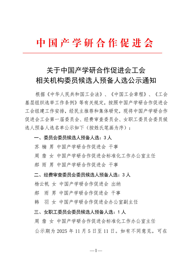关于中国产学研合作促进会工会 相关机构委员候选人预备人选公示通知